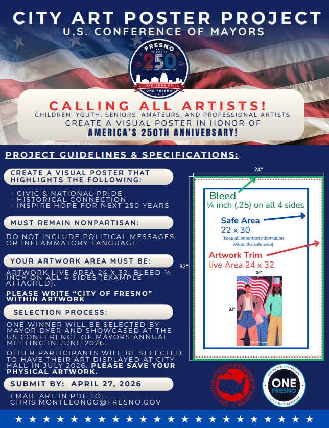 The City of Fresno is seeking artists of all ages to create a visual poster that highlights civic and national pride, historical connection, and inspires hope for the next 250 years. The poster should not include any political messages or inflammatory language.