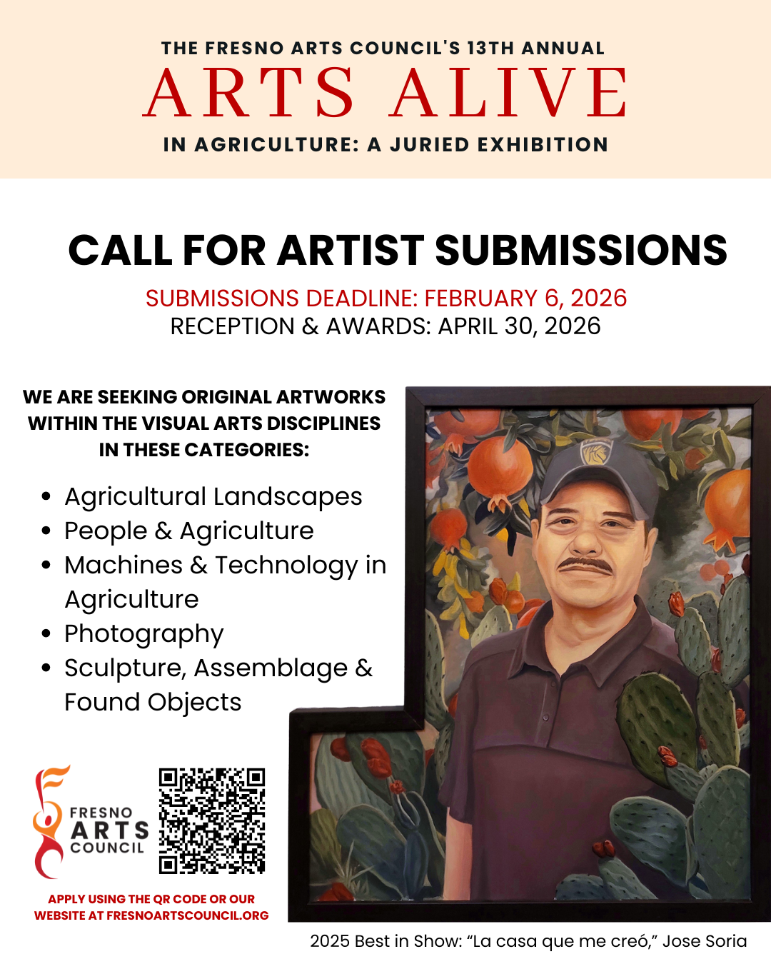 The Fresno Arts Council is now accepting submissions for the 13th Annual Arts Alive in Agriculture Juried Exhibition. The Arts Alive in Agriculture Juried Art Show is an annual juried art show that honors the agricultural roots, resources, and traditions of the ethnically-diverse communities in the Central Valley, a large expanse of rich farm land throughout California's San Joaquin Valley that produces the fruits and crops needed to feed the world. The Fresno Arts Council seeks to highlight the Central Valley's agricultural industry by showing original works of art created by Central Valley-based artists.