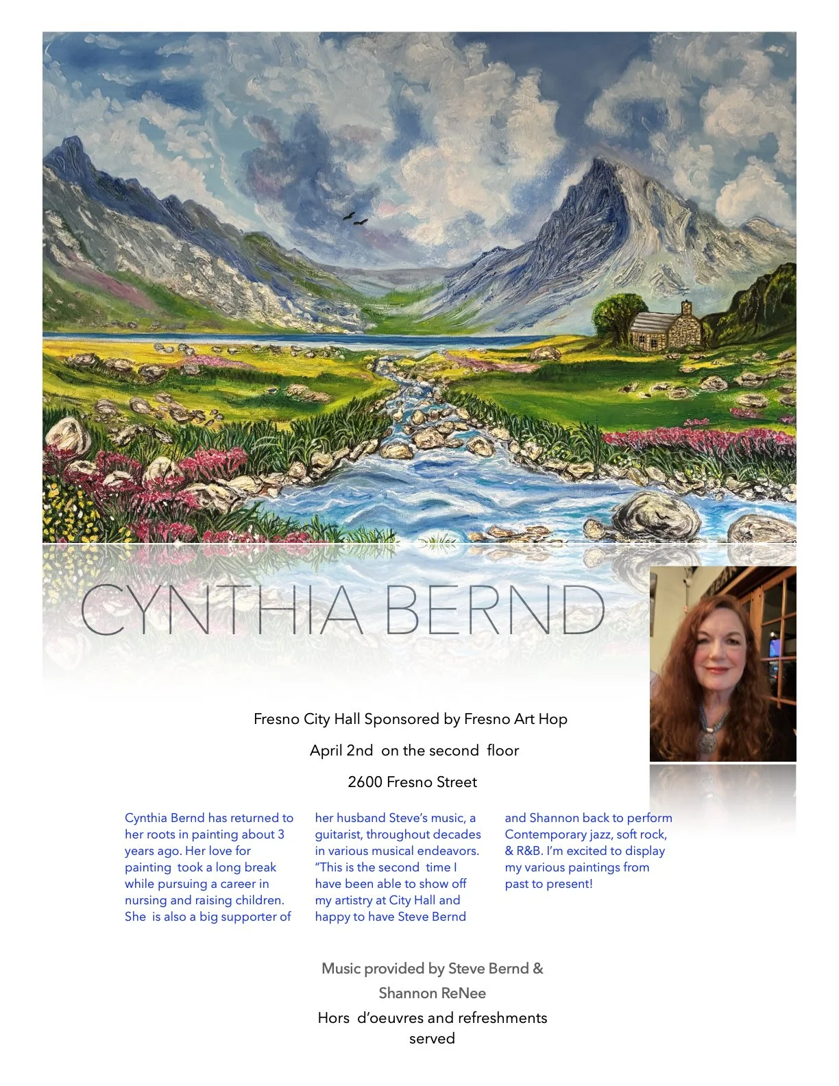 Fresno City Hall Art Gallery Current Show: April 1, 2026 - April 30, 2026Reception: April 2, 2026 during ArtHop First Floor Spectrum Art Gallery Second Floor Cynthia Bernd